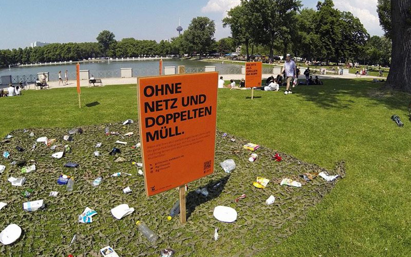 Zu den Maßnahmen der Live-Kampange gehören Beschilderung, Give-aways, Aufklebern inklusive QR-Codes zur digitalen Vernetzung, Mitarbeiter-Branding und einem auffälligen Müllnetz, das das Abfallproblem schnell erfassbar visualisiert. Ergänzend dazu eine Mitmach-Microsite mit Twitter- und Instagram-Anbindung. Dank des responsiven Designs können die Grill-Scouts den Grillenden die Microsite auf den mitgeführten iPads vorführen.