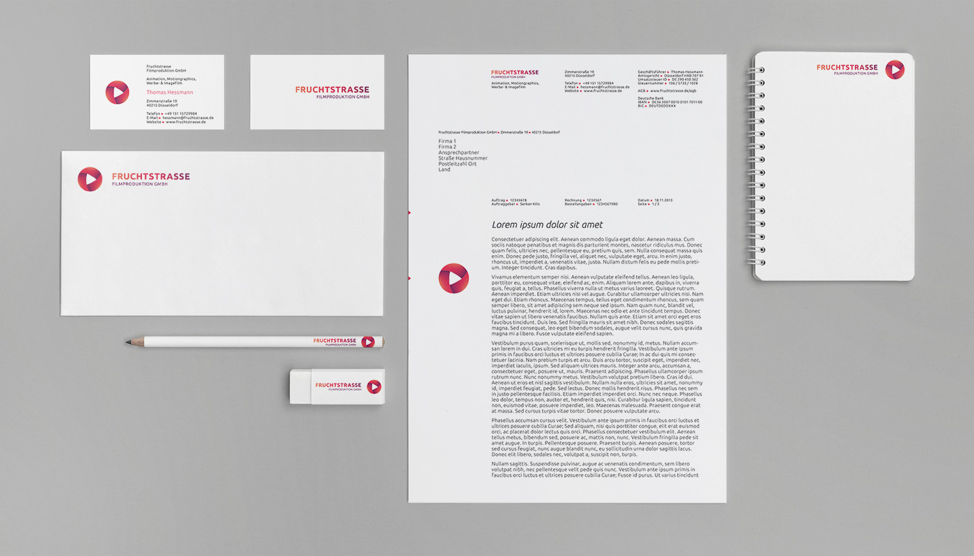 Die Fruchtstraße ist eine junge Videoagentur mit Sitz in Friedrichstadt, Düsseldorf. Für den Start von Fruchtstraße wurde ein fruchtig frisches Basispaket für das Erscheinungsbild benötigt. Die zentrale Komponente der minimalistischen Geschäftsausstattung ist ein Play-Icon. Auch das Logo bedient sich der typischen Bestandteile und ist eine Mischung aus Blende und Play-Button.