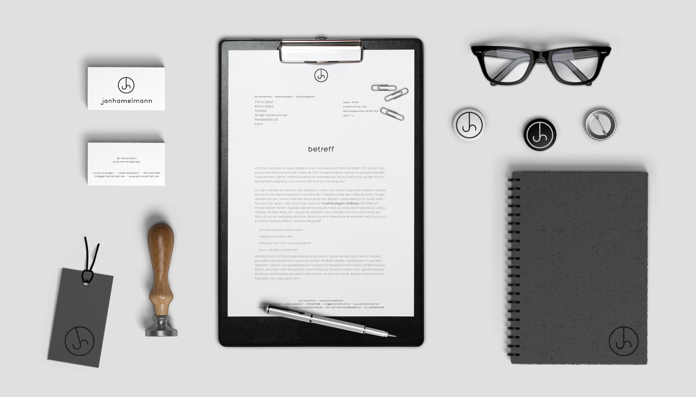 Jan Hamelmann betreibt eine Unternehmensberatung für Projektleitung und Marketing. Für den befreundeten Jungunternehmer galt es, ein ansprechendes Erscheinungsbild zu entwickeln, das die Arbeitsweise unterstreicht. Dabei entstand ein Basis-Paket an Geschäftsausstattung.