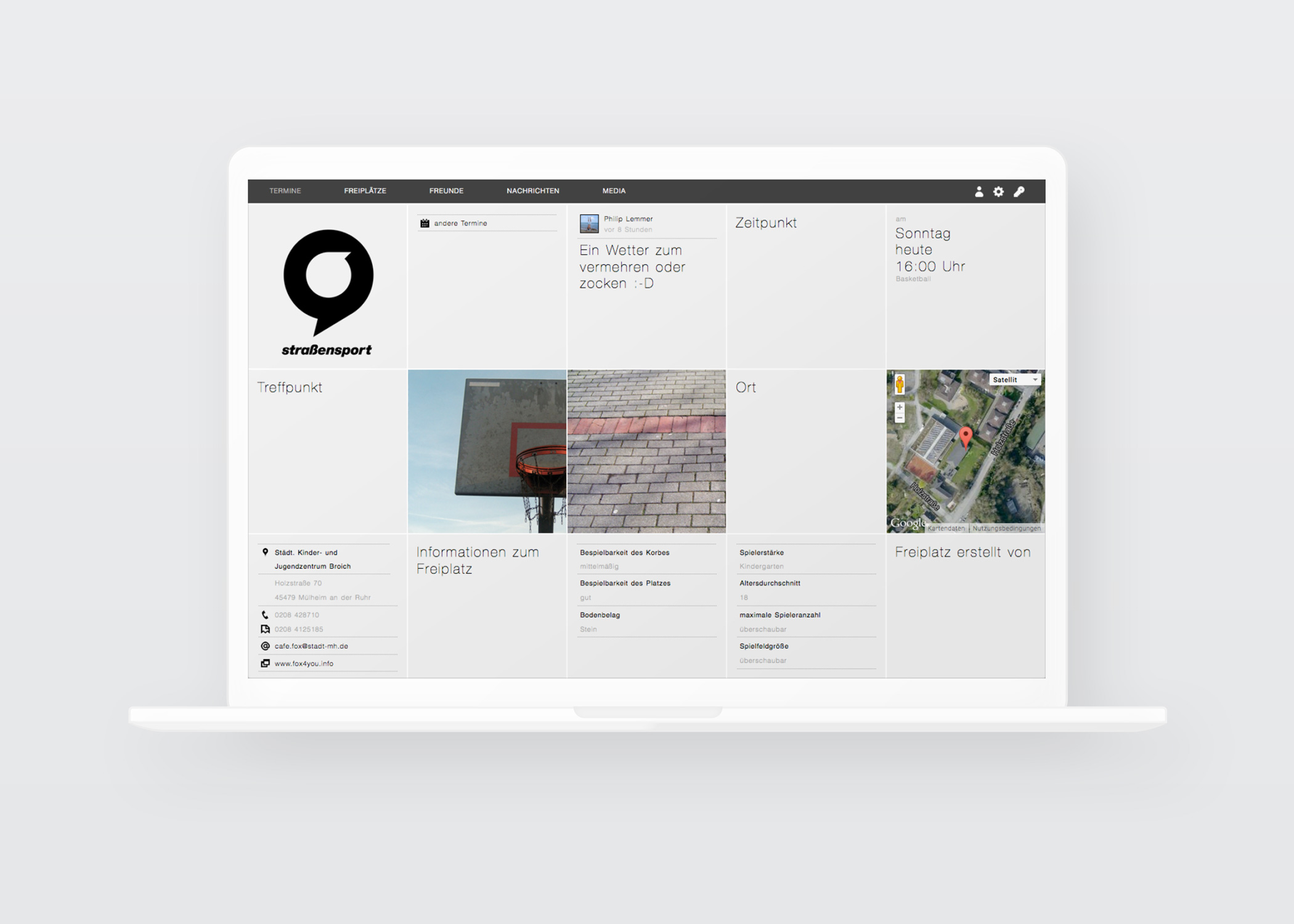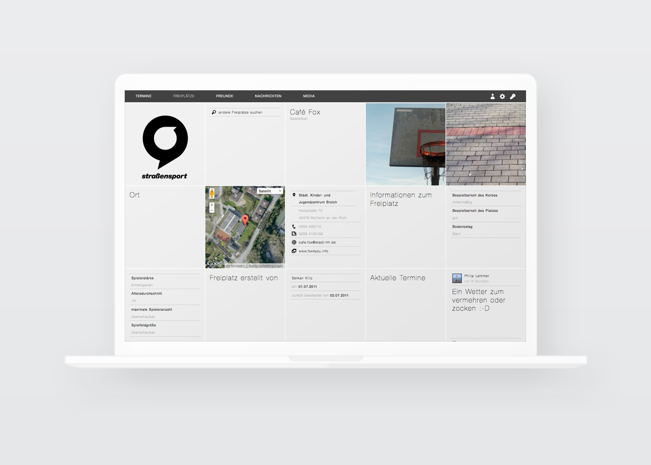 Innerhalb der staßensport-Community hat ein Mitglied die Möglichkeit seinen Lieblingsplatz online zu stellen, um Termine für gemeinsame Treffen bereitzustellen, an dem sich andere beteiligen können.