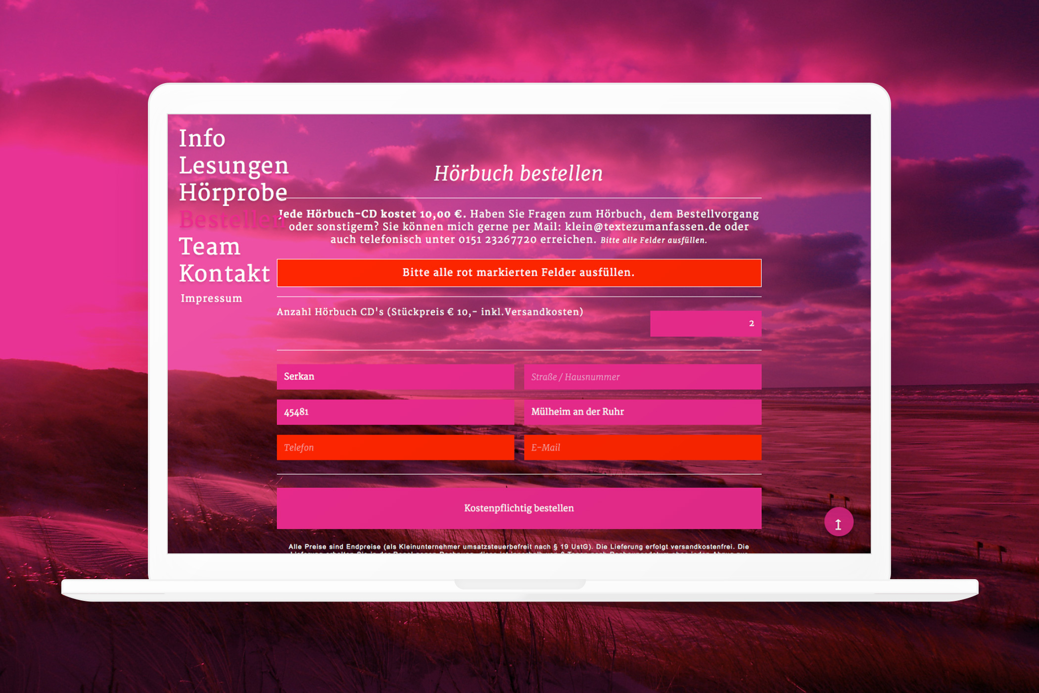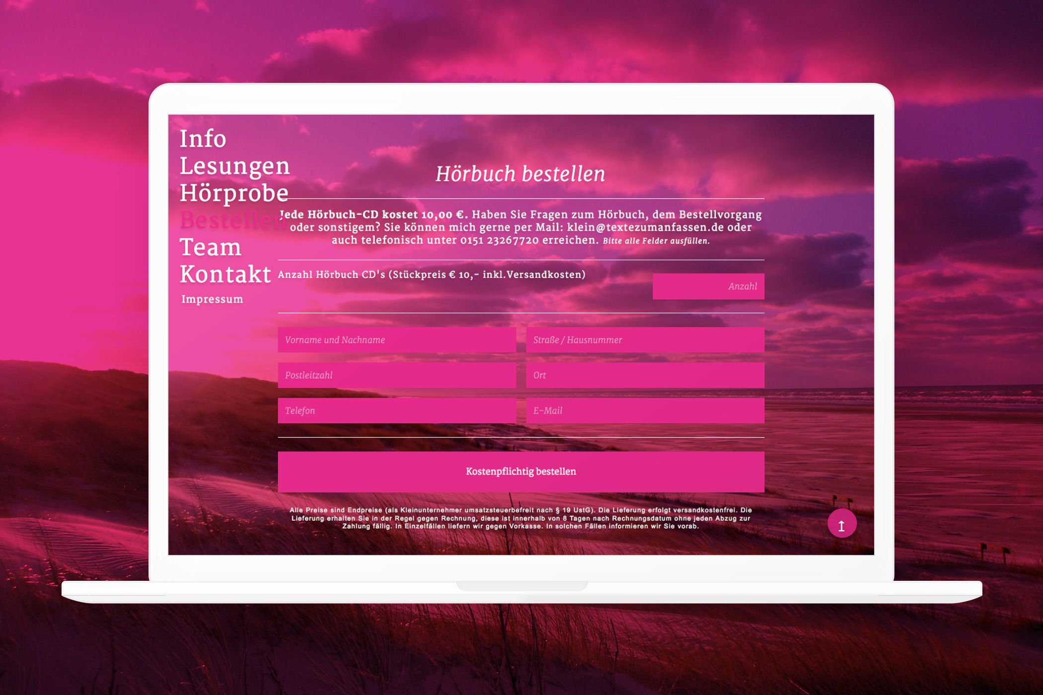 Auf der responsiven Website kann man sich eine Hörprobe des Hörbuchs anhören und dann auch bestellen.